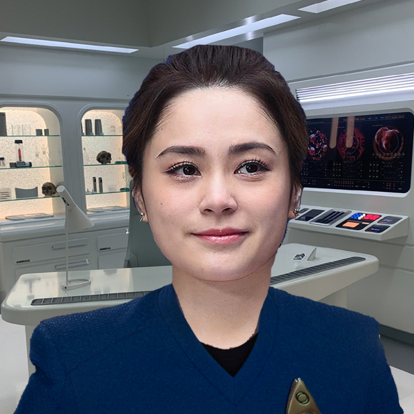 | Physical Description | Hair tied into a short ponytail. Wears a short sleeved, minidress version of the female Starfleet uniform (allows for easier mobility of the arms without being restricted by cuffs) when performing duties. Legs shown to be quite firm and muscular, having boasted of hiked the breadth distance of Hong Kong Island (Kennedy Town to Chai Wan, 16 kilometres) in 8 hours, with hiking up to Lion Rock in Wong Tai Sin being another favourite. Right forearm still shows the scars of the Klingon disruptor bolt graze. |